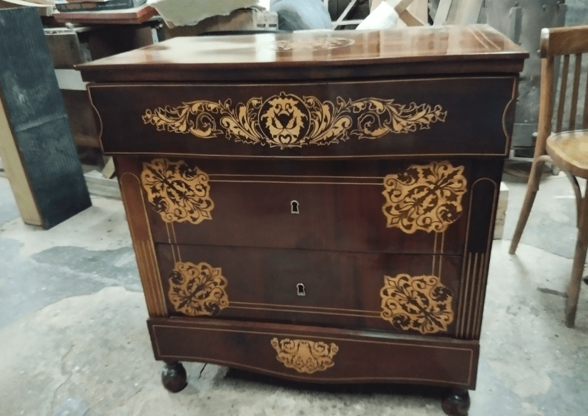 Antigua cómoda isabelina de medidas pequeñas con marquetería en buen estado